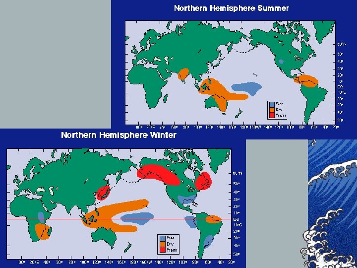 ©Durante un episodio de Niño, los alisios amainan o soplan incluso en sentido contrario, de tal forma que el anticiclón permanente en la costa americana es sustituido por una borrasca, que acarrea fuertes y graves inundaciones. ©En el otro lado del Pacífico se instala un anticiclón que genera graves sequías.