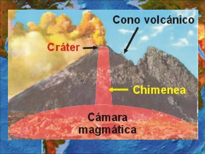 Volcanes • Chimeneas del interior de la tierra, desde donde son expulsados lavas, rocas y gases. • Sus ubicaciones no es un hecho al azar (como nada en la naturaleza, sino que corresponde a como están organizadas las placas de la litosfera.