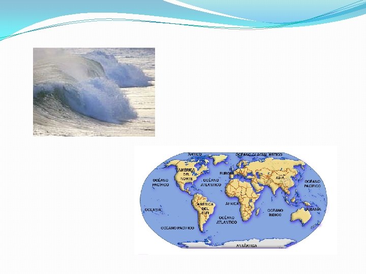 Movimientos en mares y océanos �La enorme masa de agua que forma los mares y océanos de la Tierra está sometida a movimientos de diversa naturaleza, de forma parecida a como sucede en la atmósfera. El agua tiene menos densidad que el aire, pero más que la tierra. �Se pueden resumir estos movimientos en tres grupos: las olas y las mareas, que se perciben en la superficie, y las corrientes marinas, que discurren por el interior y que son de una gran importancia en la determinación del clima. �Las olas son producidas por los vientos que barren la superficie de las aguas. Mueven al agua en cilindro, sin desplazarla hacia adelante pero, cuando llegan a la costa y el cilindro roza con el fondo, inician una rodadura que acaba desequilibrando la masa de agua, produciéndose la rotura de la ola.