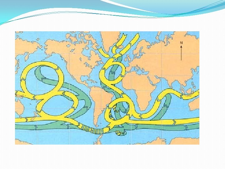 Corrientes Marinas �Las mayores corrientes superficiales oceánicas en el mundo están causadas por los vientos dominantes. Las corrientes pueden ser frías, como la corriente de deriva del viento del oeste, o cálidas, como la corriente del Golfo. Las corrientes circulan en trayectorias llamadas giros, moviéndose como las agujas de un reloj en el hemisferio norte y al contrario en el sur. �El giro de la Tierra hacia el Este influye en las corrientes marinas, porque tiende a acumular el agua contra las costas situadas al oeste de los océanos, como cuando movemos un recipiente con agua en una dirección y el agua sufre un cierto retraso en el movimiento y se levanta contra la pared de atrás del recipiente. Así se explica, según algunas teorías, que las corrientes más intensas como las del Golfo en el Atlántico y la de Kuroshio en el Pacífico se localicen en esas zonas.