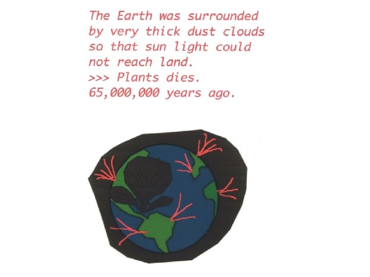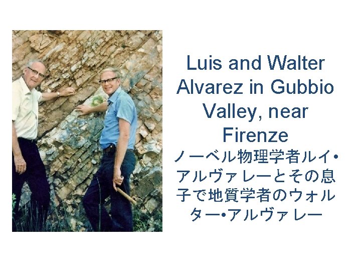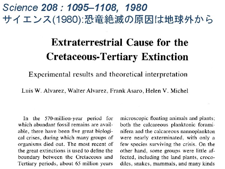 Geologist >>>recognized a black layer. Chemical analysis >>> too much Iridium Scientists >>> meteorite hit the earth >>> Calculation to verify theory >>> Extended theory into a nuclear war >>> NASA discovered the crater >>> Geologists verified the crater age >>> Army and dinosaur specialists failed to discredit theory >> confirmation 地質学者>化学者>物理学者>天体物理学者> NASA>軍隊>政治家>冷戦終結と核戦力削減
