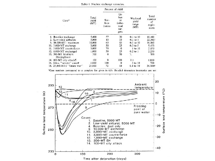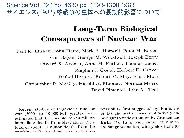 “Extraterrestrial Cause for the Cretaceous-Tertiary Extinction” 「 恐竜絶滅の原因は地球の外からきた」アルヴァレー他(サイエンス 1980) Luis W. Alvarez, Walter Alvarez, Frank Asaro, Helen V. Michel [Science 1980] “Nuclear Winter: Global Consequences of Multiple Nuclear Explosions” 「核戦争のもたらす地球規模の影響」セーガン他(サイエンス 1983) R. P. Turco, O. B. Toon, T. P. Ackerman, J. B. Pollack, Carl Sagan [Science 1983] “Long-Term Biological Consequences of Nuclear War” 「核戦争の長期的生体への影響」エーリッヒ他(サイエンス 1983) Paul. R. Ehrich, et. al. [Science 1983] “The Great Tambora Eruption in 1815 and Its Aftermath” 「1815年のタンボラ火山の噴火が残した大災害」ストザース他(サイエンス 1984) Richard B. Stothers [Science 1984] “Widespread after-effects of nuclear war” Edward Teller [Nature 1984] 「核戦争のもたらす広範な後遺症」テラー(ネイチャー 1984) “The Cold and the Dark: the world after nuclear war” [Carl Sagan 1985] 「冷たく暗い核戦争後の世界」セーガン著 1985 “Fire and ice: nuclear winter” [Michael Rowan-Robinson 1985] 「火焔と氷の世界:核の冬」ローワンロビンソン著 1985 その他 軍関係の反論への試みの失敗なども発表された