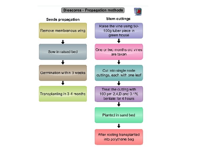 Propagation • • The yams can be propagated either by seeds, rhizome pieces or stem-cuttings. In India, a)Propagation from tuber pieces This crop grows best from tuber pieces. Tubers or rhizomes are divided into approximately 50 -60 g pieces for planting. The growth of plants is slow and the yield lower if smaller pieces are used for planting. There are 3 types of pieces (1) Crowns (stem end), (2) Medians (middle portion) and (3) Tips (distal ends). Crowns produce new shoots within 30 days of planting, while the others take nearly 100 days to sprout. Besides, the crown portion contains less diosgenin compared to the median and the tips, hence the later can be used for the extraction of alkaloids and the former can be used for propagation. But, if there is a shortage of planting material, the median and tips can also be used for planting. In order to avoid the rotting of tubers (before sprouting), only healthy tubers should be selected. The healthy tubers must then be dipped in benlate fungicide (0. 3%) for 5 minutes followed by dusting the cut ends with 0. 3% benlate powder before planting or storage. Before planting the tubers directly in the main field, they should be stored in a moist, well-areated rooting medium until shoot growth commences. The benlate-treated tuber pieces should be kept in raised beds in the shade, covered with sand watered daily. After 30 days the sand may be removed and the sprouted crowns taken out and planted in the field. The median and tip portionsare again covered with sand watered regularly. Subsequently, after 60