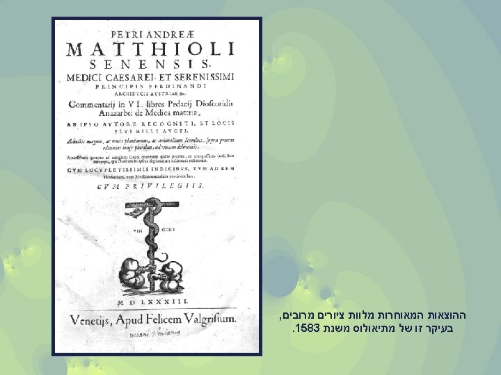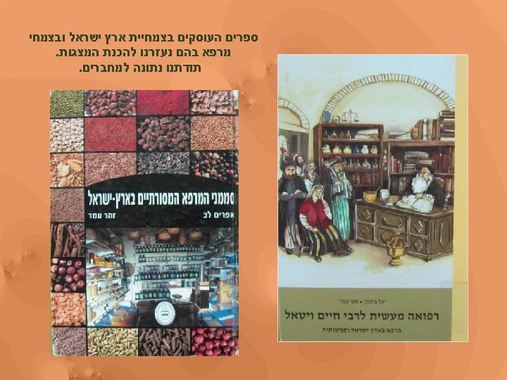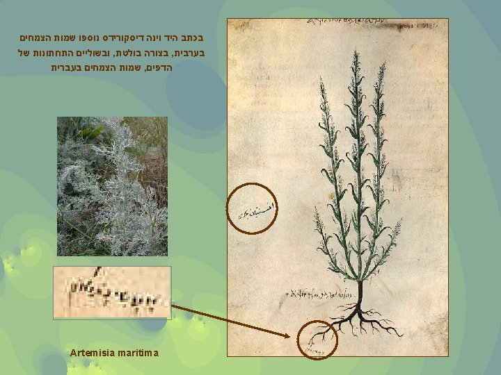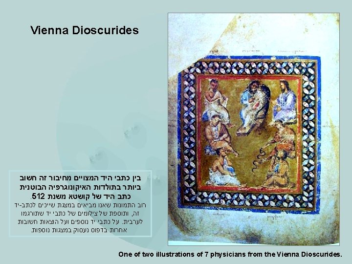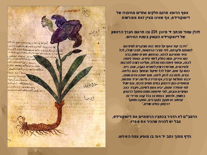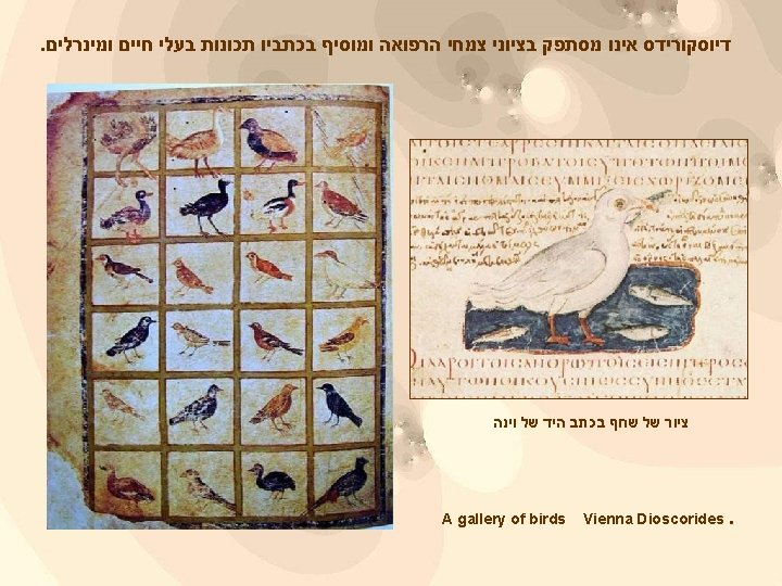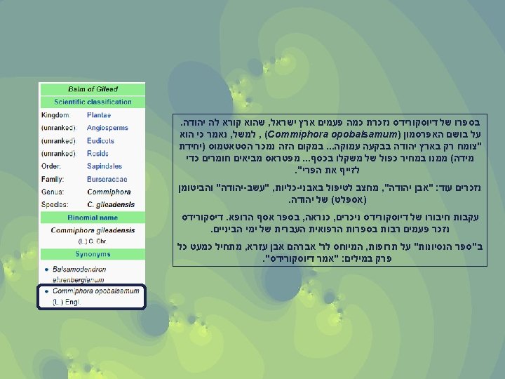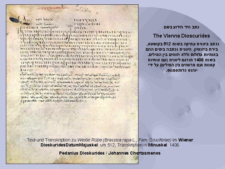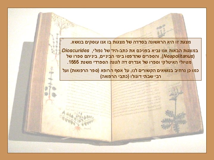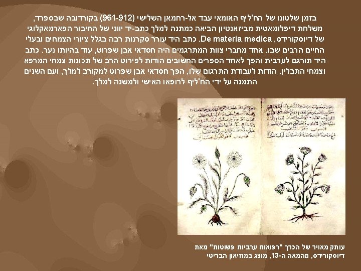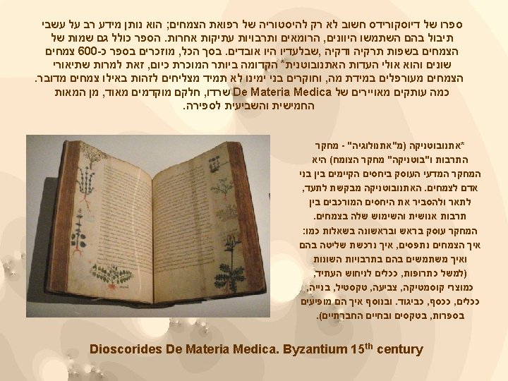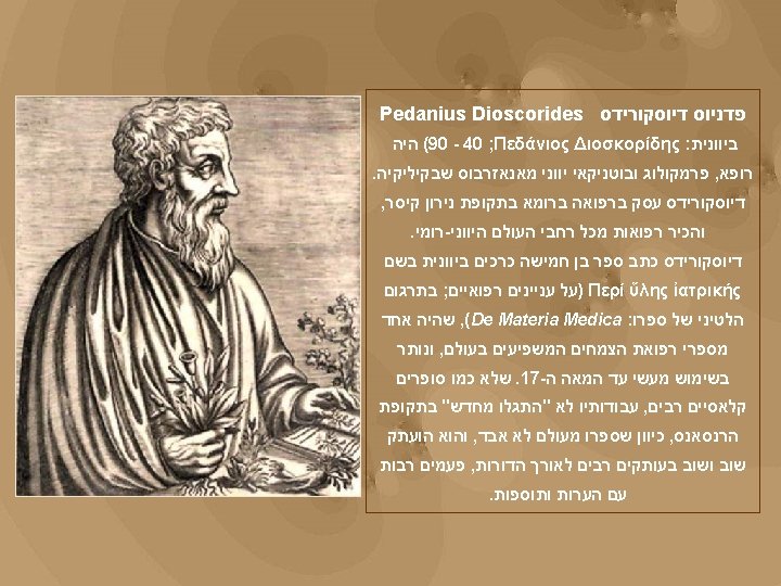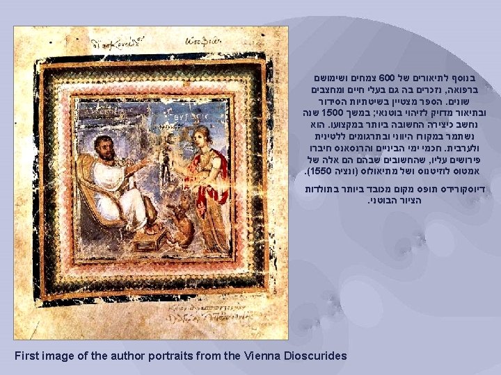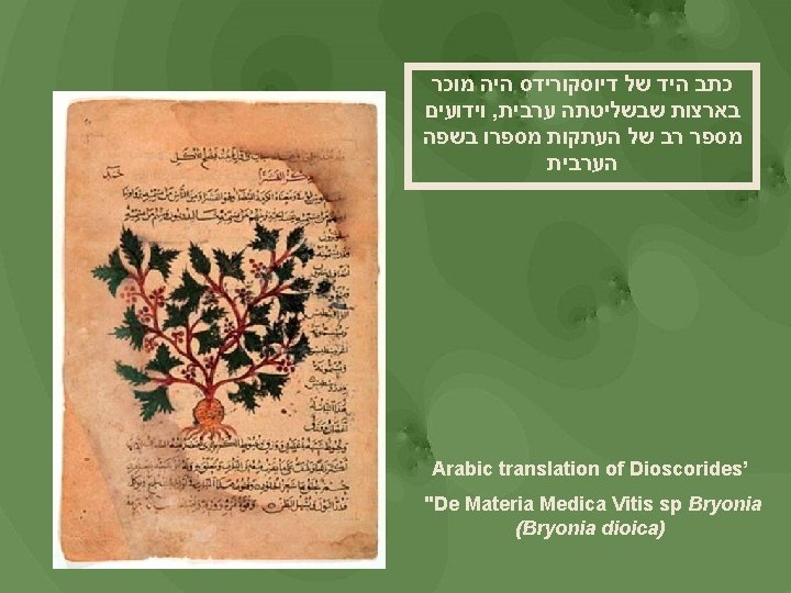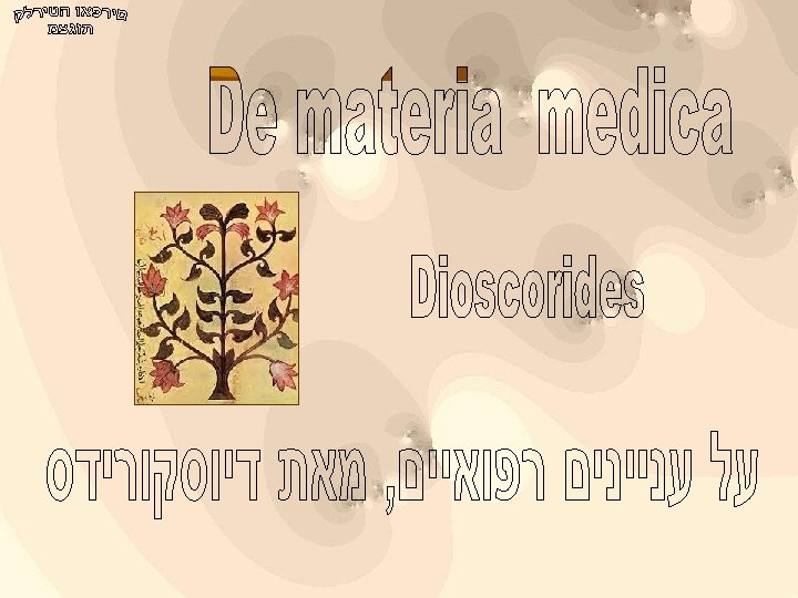 : מקורות http: //en. wikipedia. org/wiki/Materia_medica http: //es. castellano/De_materia_medica http: //en. wikipedia. org/wiki/Pedanius_Dioscorides דיוסקורידס http: //he. wikipedia http: //es. wikipedia. castellano/Dioscorides http: //dioscorides. usal. es/ http: //fr. wikipedia. org/wiki/Dioscoride_de_Vienne http: //commons. wikimedia. org/wiki/Category: Vienna_Dioscurides? uselang=de https: //www=Dioscorides+De+Materia+Medica http: //www. metmuseum. org/toah/works-of-art/57. 51. 21 http: //buecher. heilpflanzen-welt. de/Dioskurides-Arzneimittellehre/ http: //oldflowerpictures. blogspot. co. il/ : Medicinal properties of Commiphora gileadensis http: //www. academicjournals. org/ajpp/pdf 2010/august/Iluz%20 et%20 al. pdf ואפרים קלריטה : שלנו לאתר להיכנס מוזמנים הנכם www. clarita-efraim. com chefetze@netvision. net. il