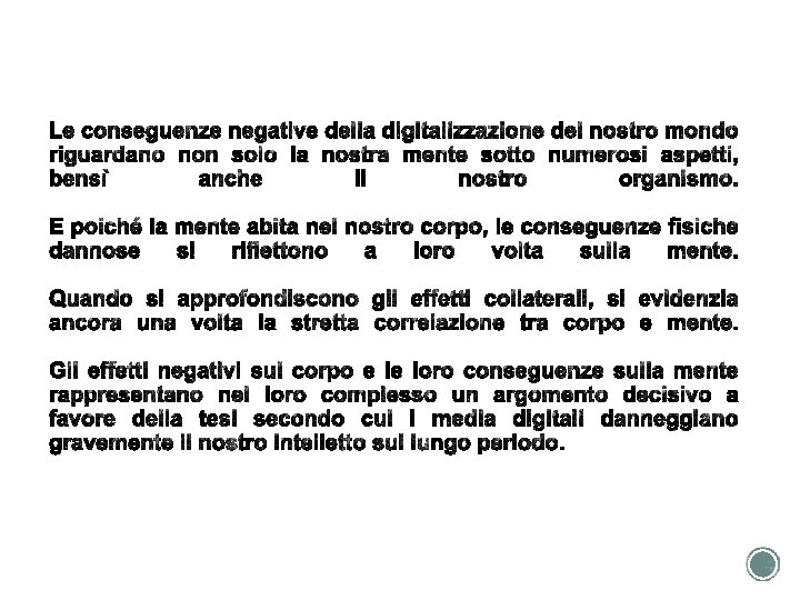 Concetto Centrale: Più tardi veniamo esposti al sistema digitale (comunque dopo l’età dello sviluppo) più facilmente riusciamo a mantenere intatte le capacità cognitive che vengono compromesse da un uso intenso dei media digitali. Un adulto che comincia ad utilizzare i media digitali dispone di sufficiente esperienza nella ricerca, memorizzazione e gestione delle informazioni, perché ha sedimentato nel suo cervello un passato «analogico» . Un bambino che non ha ancora sviluppato la corteccia prefrontale (che guida il comportamento previsionale, la pianificazione di schemi di azione nel tempo, la capacità di relazione con il mondo esterno) e che viene precocemente esposto ai media, crea da zero le sue capacità cognitive di base sul modello digitale, con tutte le conseguenze osservate.