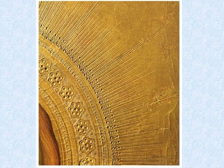 TIPI DI DORATURA SU TAVOLA Doratura a guazzo (tecnica tradizionale) Nella doratura a guazzo l'oro viene steso per primo sulla tavola, ed in seguito si passa alla pittura vera e propria. La tavola viene preparata incidendo il bordo dell'area da dorare, dopo di che si applica il bolo unito a bianco d’uovo, acqua o anche colla ed infine la lamina metallica. Doratura a missione La lamina metallica viene applicata su una sostanza oleoresinosa che ha potere adesivo e non viene brunita. Doratura a conchiglia Polvere d’oro unita a un legante, colla o uovo, e applicata a pennello come fosse un pigmento