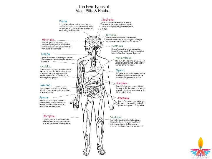 The five types of Kapha • • • Kledaka – stomach (amasya) Avalambaka – heart, chest (Hrdaya) Bodhaka – throat and tongue (kantha) Tarpaka – head (siras) Sleshaka – bony joints (sandhis)