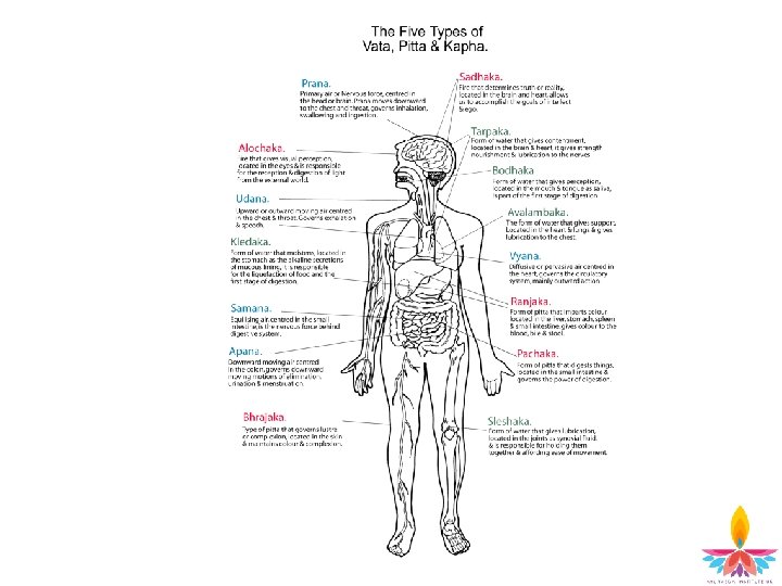 The seats of the Pancha Vata • Udana Vata – throat • Prana Vata – heart • Samana Vata – stomach and small intestine • Apana Vata – large intestine and rectum • Vyana Vata - entire body (head, trunk and extremities)