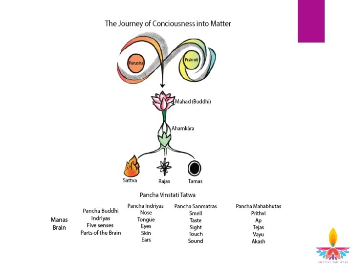 Sattva, Rajas, Tamas Sattva is the pure essence of light, right action, spiritual purpose Rajas is the principle of movement, change, excitability Tamas is inertia, darkness, confusion All are qualities of the mind Mind needs a tangible agent through which to serve its purpose, that is, the body