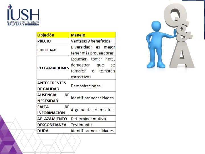 Objeciones claramente definidas: 1. Precio 2. Fidelidad 3. Reclamaciones 4. Antecedentes de calidad 5. Ausencia de necesidad 6. Falta de información