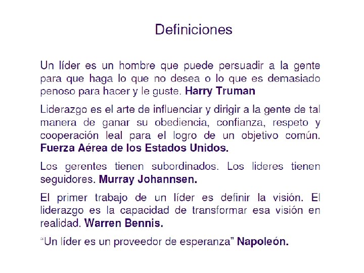 ¿El líder nace o se hace? ♦ El liderazgo es algo más complejo que haber nacido con los genes adecuados: Hay líderes chatos, feos, pintones, nerviosos, de todos colores, sonrientes, etc. ♦Sin embargo, es verdad que hay personas que tienen condiciones naturales de liderazgo: Innovadores, visionarios, con pasión ♦ Es más, hay personas que no tienen las condiciones innatas, pero con mucho esfuerzo las pueden desarrollar. El liderazgo es un conjunto de hábitos y actitudes que uno puede adquirir.
