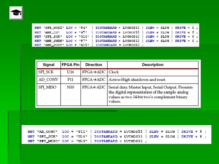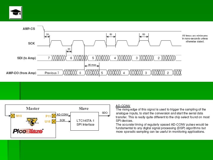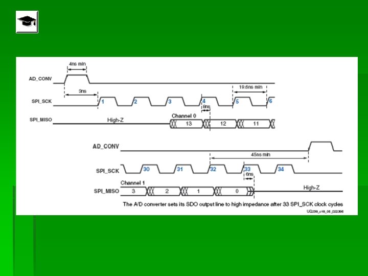 Control de la interface SPI § Cuando la señal AD_CONV va a alto, el ADC simultáneamente muestrea ambos canales analógicos. § El resultado no se presenta hasta la próxima señal en AD_CONV § La máxima razón de muestreo es de 1. 5 MHz § La señal muestreada se representa en notación complemento a 2 en 14 bits