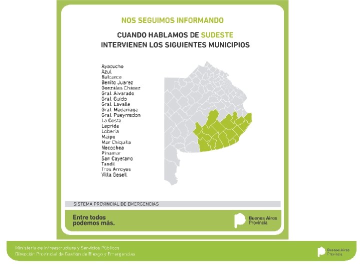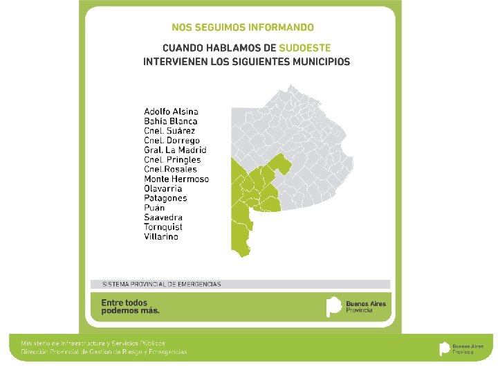 Estrategias de Reducción de Riesgos para cada sector y cada municipio - Análisis y evaluación del riesgo: Identificar las amenazas y vulnerabilidades del municipio (Mapa). - Sistema de Alerta Temprana: Protocolos de alerta y contingencia. - Mesas de trabajo transversal: Encuentros entre las diversas áreas del municipio. Planificación de Estrategias de Reducción de Riesgos Planificación y Medio Ambiente / Desarrollo Social y Vivienda / Comunicación / Medio Ambiente / Producción y Asuntos Agrarios / Defensa Civil y Bomberos ADA (Autoridad del Agua Pcia de Buenos Aires) - INTA (Instituto Nacional de Tecnología Agropecuaria) SMN (Servicio Meteorológico Nacional) - Talleres de Gestión de Riesgo por inundaciones: Río Areco, Río Arrecifes, Río Luján, Sauce Chico, Sauce Grande y Cuenca Capital - Talleres de Gestión de Riesgo por incendios forestales: Sudoeste de la Provincia de Buenos Aires.