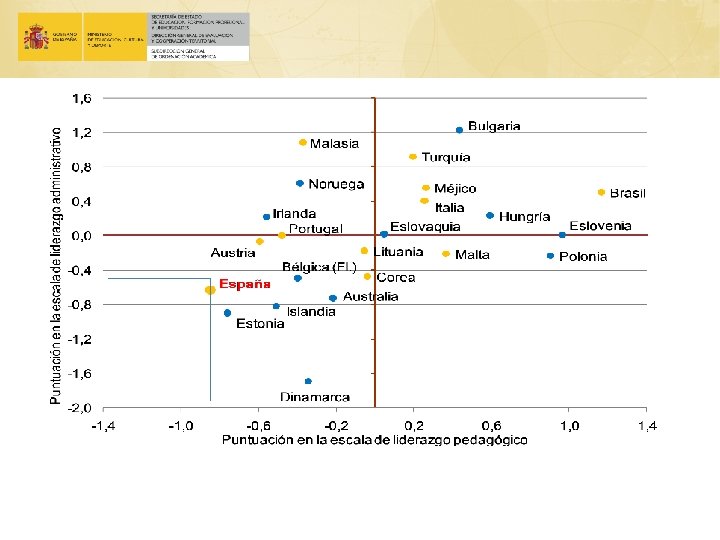 INFORME TALIS España obtiene la puntuación más baja en liderazgo pedagógico. En liderazgo administrativo, España se sitúa también por debajo de la media TALIS; es decir, los directores españoles ejercen un moderado liderazgo administrativo en comparación con sus colegas TALIS, por encima de Dinamarca, próximo al de Bélgica, pero a importante distancia de Portugal, Italia o Noruega.