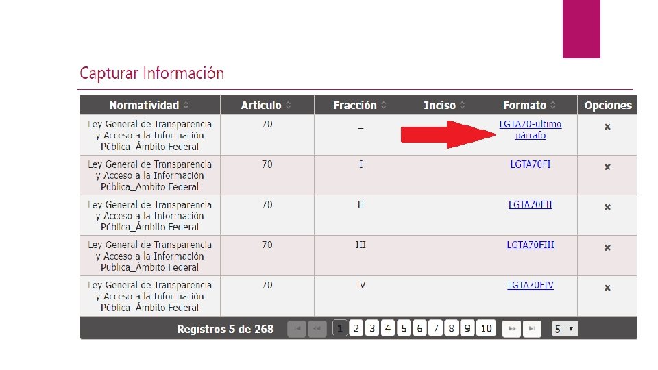 Normatividad relevante Ley General de Transparencia Lineamientos Técnicos Generales * Lineamientos para la implementación y operación de la Plataforma Nacional de Transparencia * Lineamientos Técnicos Generales para la publicación, homologación y estandarización de la información de las obligaciones establecidas en el Título Quinto y en la fracción IV del artículo 31 de la Ley General de Transparencia y Acceso a la Información Pública, que deben de difundir los sujetos obligados en los portales de Internet y en la Plataforma Nacional de Transparencia