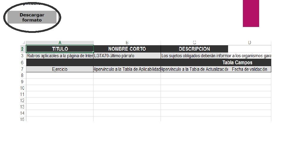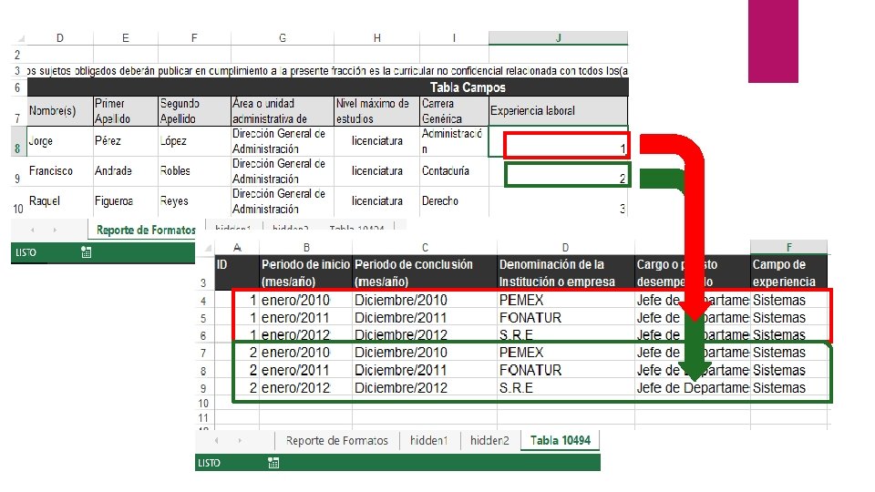 Formatos carga masiva (Excel): Campos tipo “Tabla” Con el propósito de no repetir un renglón en un listado principal, una tabla nos permitirá vincular el registro a varios renglones mediante un número de identificación único. PE. Artículo 70 fracción XVII