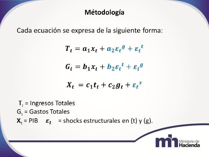 Metodología Se parte de un Modelo de Vectores Autorregresivos (VAR), que integra la dinámica entre variables. La serie de datos son trimestrales y reales (deflactor del PIB); además, le fueron aplicadas las pruebas de estacionariedad, cointegración, rezagos óptimos, etc. Con el VARS se estiman los shocks tanto del ingreso, como de gasto, aplicando restricciones y supuestos. El objetivo principal de ambos modelos es el uso de la función de impulso-respuesta (FIR), que es donde se estiman los shocks, en nuestro caso fiscales.