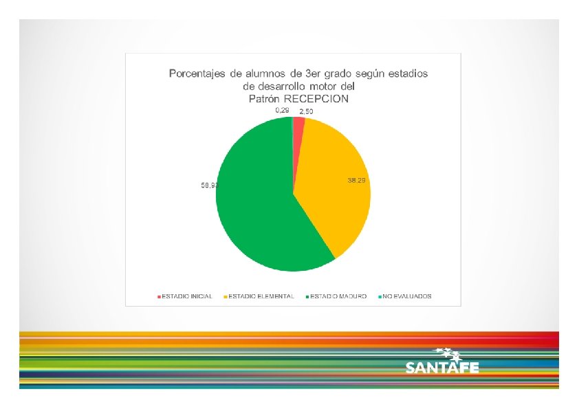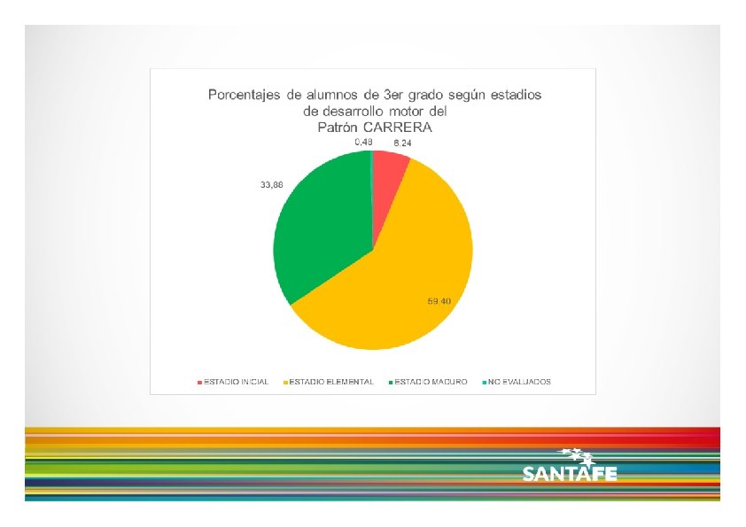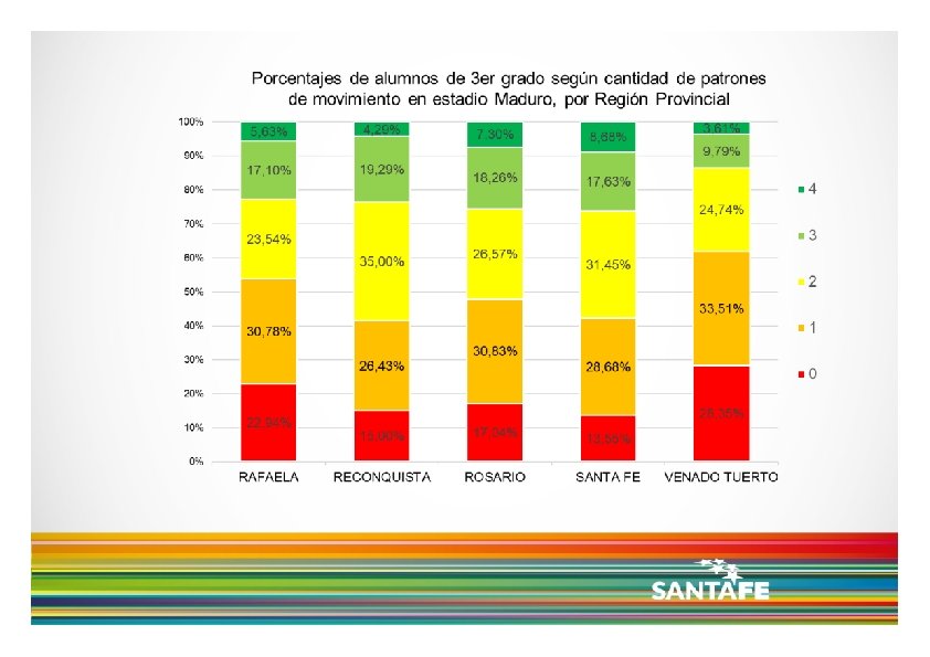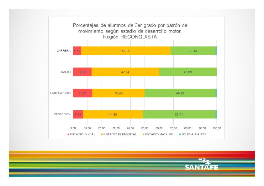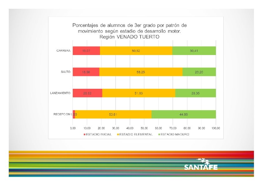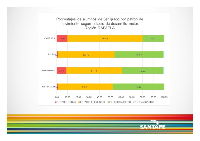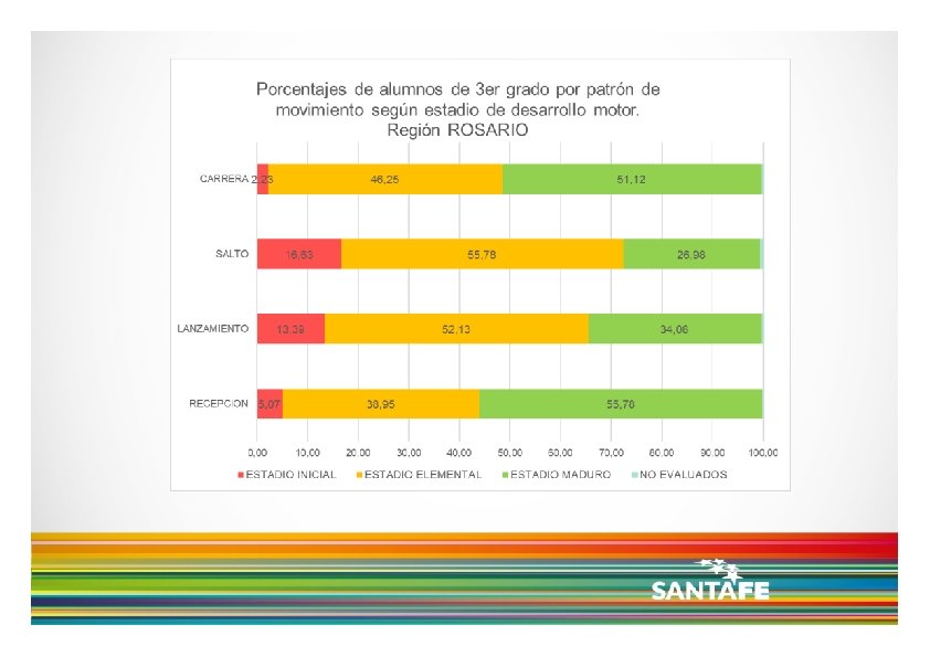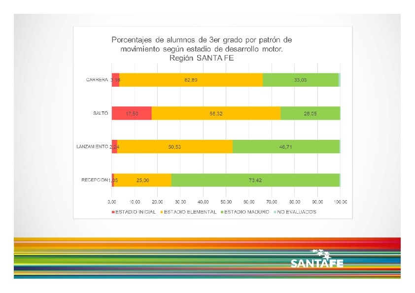 Dicho esto, de acuerdo a los resultados presentados, se observa que: los niños y niñas de 3 er grado asistentes a los CEFs de la Pcia. de Santa Fe, no parecen lograr el nivel de desarrollo motor esperado, teniendo en cuenta los cuatro patrones de movimiento analizados cuando se analizan en forma conjunta o simultánea, es decir cuando se consideran los niños y niñas que alcanzan 3 o 4 patrones en estadio Maduro, vemos que sólo un 25% logra dicho nivel de desarrollo. de los cuatro patrones de movimiento, la recepción parece ser el que logra mayores niveles de desarrollo, mientras que la carrera y el salto son los que presentan menores porcentajes de niños y niñas en estadio Maduro. no se observan grandes diferencias en cuanto al desarrollo motor, entre Regiones Provinciales.