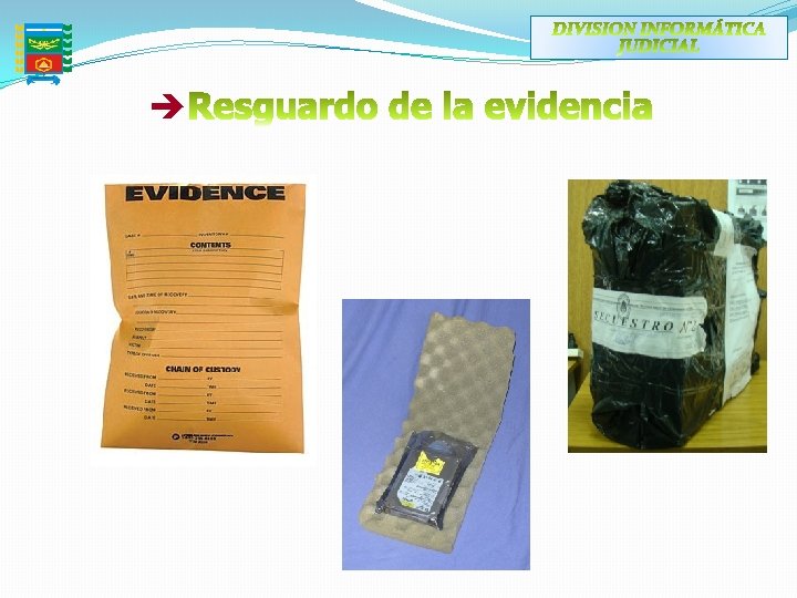 DIVISION INFORMÁTICA JUDICIAL CADENA DE CUSTODIA • • • Fecha de contacto con la evidencia Nombre de la persona Registro del pasaje de una persona a otra Registro del pasaje de una ubicación física a otra Tareas realizadas durante la posesión Sellado de la evidencia al finalizar la posesión Registro de testigos Fotografías de la evidencia en las tareas realizadas Log de actividades durante la posesión