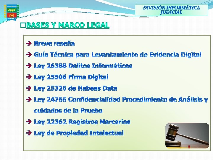 DIVISION INFORMÁTICA JUDICIAL CADENA DE CUSTODIA • DOCUMENTAR: – Qué es la evidencia? – Cómo se la obtuvo? – Cuándo fue obtenida? – Quién la obtuvo? – Dónde viajó? – Dónde fue guardada?