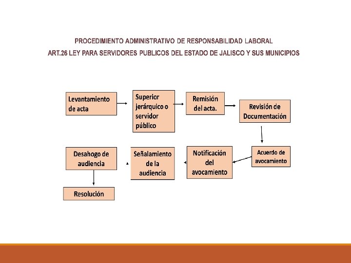 PROCEDIMIENTO ADMINISTRATIVO DE RESPONSABILIDAD LABORAL ART. 26 PASOS PARA DESAHOGAR PRL: 1. - Levantamiento del acta administrativa: el superior jerárquico o servidor publico mediante oficio facultativo, levantara acta administrativa donde asentara circunstancias de tiempo, modo y lugar de los hechos irregulares, firmada por quien la levanta y dos testigos de asistencia. 2. -Remision del acta al órgano de control disciplinario: el acta, los medios de prueba el oficio facultativo. 3. -Revision de documentación: formalidad a) Acta firmada por quien la levanto y dos testigos de asistencia B )Que la fecha de levantamiento y remisión sea acorde al art. 106 bis (prescribe a los 30 días) c) El oficio facultativo sea elaborado con fecha antes del levantamiento del acta. d) Documentales publicas, sean remitidas en original o copia fotostática certificada. 4. - Acuerdo de avocamiento y señalamiento de audiencia 5. -Notificacion del acuerdo de avocamiento 6. -Desahogo de la audiencia. -Uso de la voz a los firmantes de las actas -El servidor publico rendirá su declaración verbal o escrito -Rendirá su declaración, dos testigos de cargo y de descargo -Se otorga el derecho al servidor publico a repreguntar sobre el acta administrativa -Ofrecerá pruebas -Previo estudio, se admitirán desahogaran las pruebas -La audiencia podrá suspenderse para el desahogo de pruebas 7. - RESOLUCION DIRECCION GENERAL DE EDUCACION PRIMARIA DIRECCION DE GESTION Y OPERACIÓN PROBLEMÁTICA ESCOLAR