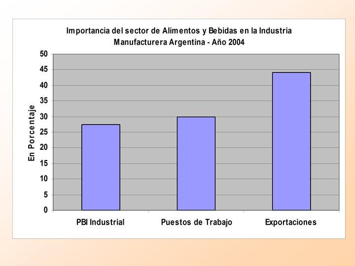 Algunos indicadores de la Industria Alimentaria de la República Argentina Monto estimado de ventas Aproximadamente 88, 5 millones de pesos en el año 2004 • 88, 3 % Elaboración de Alimentos • 11, 7 % Elaboración de Bebidas Puestos de trabajo declarados al SIJP año 2004 : 272. 943 • 84 % Elaboración de Alimentos • 16 % Elaboración de Bebidas Exportaciones año 2004 : 10. 822, 90 millones de US$ • 96, 9 % Elaboración de Alimentos • 3, 1 % Elaboración de Bebidas