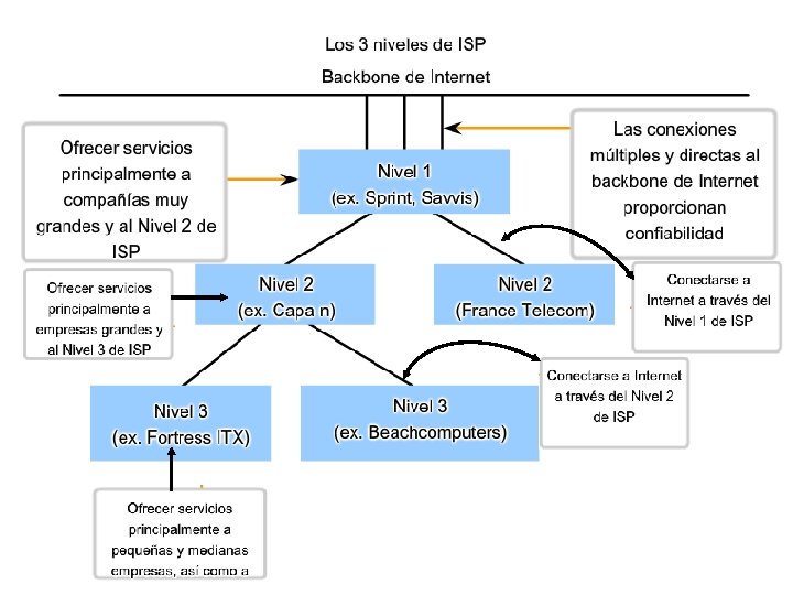 Servicios ISP Para tener acceso a los servicios de Internet, tenemos que conectar nuestra red de datos a Internet usando un Proveedor de Servicios de Internet (ISP). Los ISP poseen sus propios conjuntos de redes internas de datos para administrar la conectividad a Internet y ofrecer servicios relacionados. Entre los servicios que un ISP generalmente ofrece a sus clientes se encuentran los servicios DNS, servicios de correo electrónico y un sitio Web. Dependiendo del nivel de servicio requerido y disponible, los clientes usan diferentes niveles de un ISP.