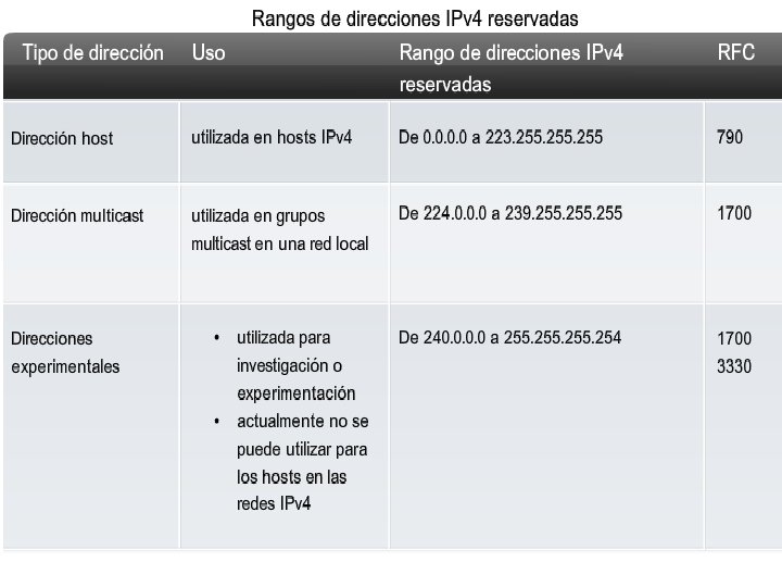 Dentro del rango de direcciones de cada red IPv 4, existen tres tipos de direcciones: 1. Dirección de red: la dirección en la que se hace referencia a la red. 2. Dirección de broadcast: una dirección especial utilizada para enviar datos a todos los hosts de la red. 3. Direcciones host: las direcciones asignadas a los dispositivos finales de la red.