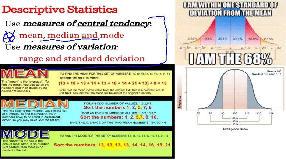 If data is approx. normal, the data will follow these characteristics Mean is: 490 SD is: 1 SD away from the mean is: 2 SD away from the mean is: 3 SD away from the mean is: AP EXAM need to know % of scores that fall with 1, 2, 3 SD’s away from X