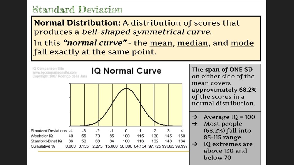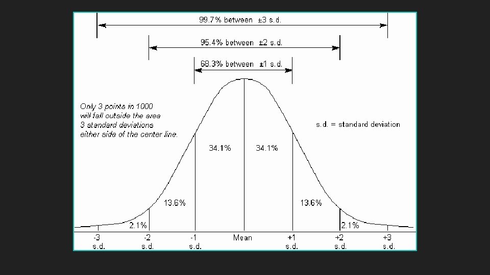Explanation Most men fall within 3 inches of the 5’ 10” mark on either side 5’ 7”-6’ 1” 3” becomes the measure of SD 68% = 1 SD from mean 95 -96% = 2 SD from mean 99% = 3 SD from mean -1 0 +1 (-3”) (+3”)