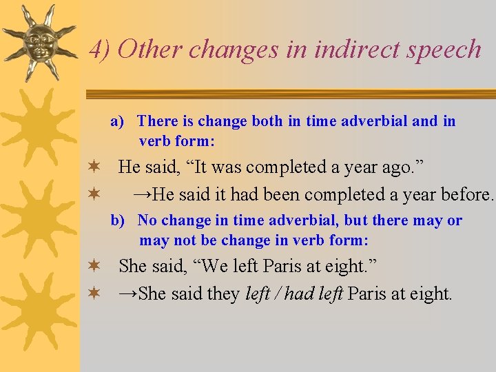 4) Other changes in indirect speech a) There is change both in time adverbial and in verb form: ¬ He said, “It was completed a year ago. ” ¬ →He said it had been completed a year before. b) No change in time adverbial, but there may or may not be change in verb form: ¬ She said, “We left Paris at eight. ” ¬ →She said they left / had left Paris at eight.