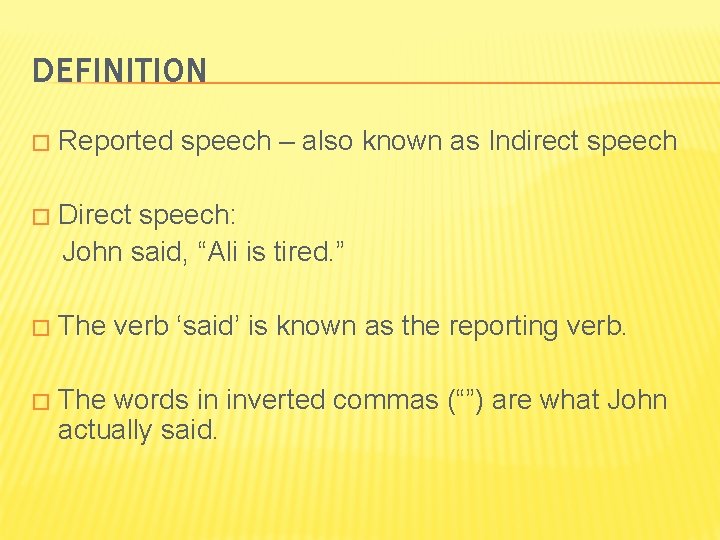 DEFINITION � Reported speech – also known as Indirect speech � Direct speech: John said, “Ali is tired. ” � The verb ‘said’ is known as the reporting verb. � The words in inverted commas (“”) are what John actually said.
