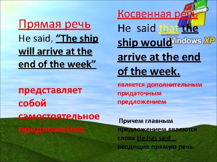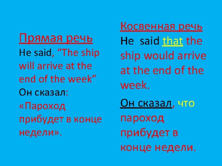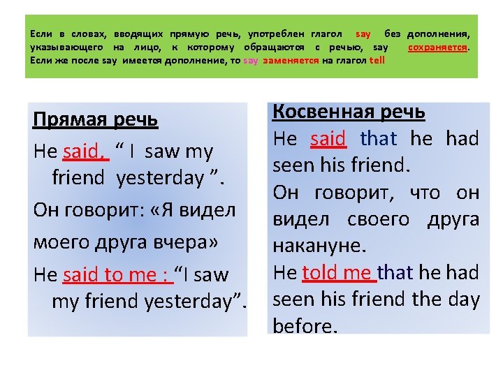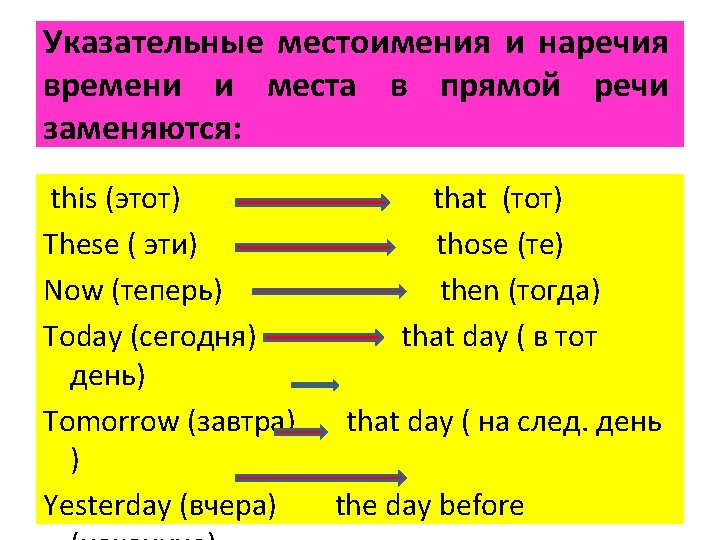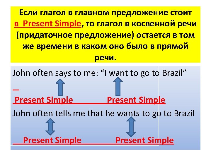 Если глагол главного предложения находится в PAST SIMPLE TENSE, то придаточное будут находиться в следующих временах Прямая речь Косвенная речь Главное придаточное главное придаточное Past Simple Present Simple Past Simple -d; -ed V 2 2 ст. V V-s; -es I, we, he, she, it you, they Present Perfect Havehas + V 3 -d; I, we, he, 3 ст you, they she, it Present Continuous To be + V ing Am, is, are -d; -ed V 2 2 ст. Past Simple -d; -ed V 2 2 ст. Past Perfect Had + V 3 -d; ed 3 ст. Past Continuous To be + V ing Was were