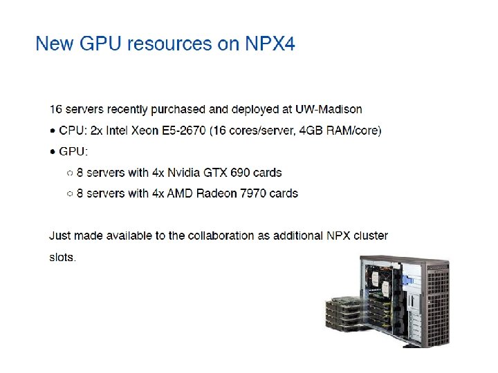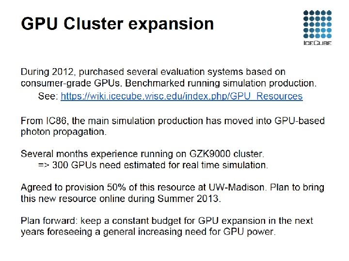 GZK 9000 GPU Cluster Deployed in 2012 at the WID/MIR datacenter (shared with CHTC @ 30%) 12 servers, each with 2 x AMD 6176 ( 12 cores/CPU) 4 x GPUs Nvidia Tesla M 2070 (448 CUDA cores/GPU)