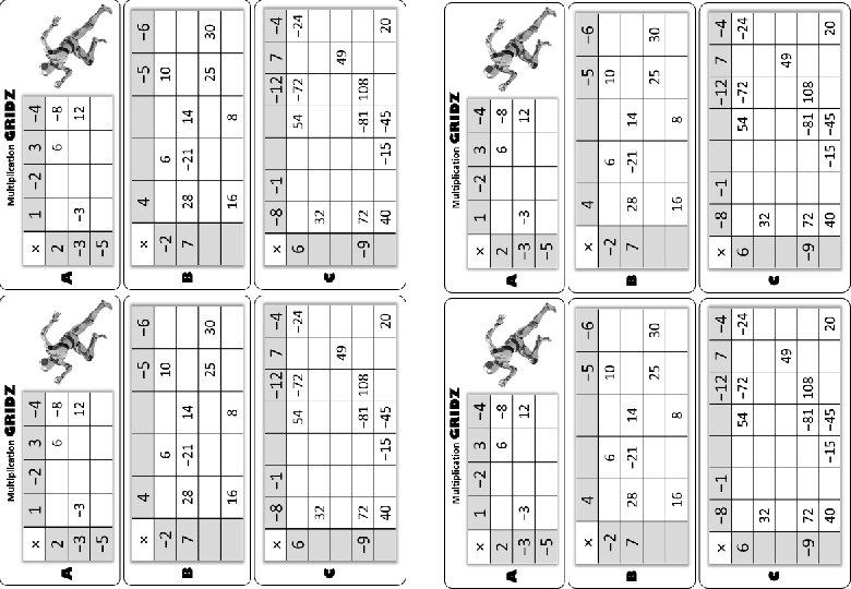 Multiplication A B C × 1 − 2 3 2 2 − 4 6 − 3 6 − 5 − 5 10 − 15 − 4 × − 2 7 − 5 4 × 6 − 4 7 − 9 − 5 − 8 12 20 4 − 3 2 − 5 − 6 − 8 28 − 20 16 6 − 21 15 − 12 − 4 14 − 10 8 10 − 35 25 − 20 12 − 42 30 − 24 − 8 − 1 3 9 − 12 7 − 48 − 6 18 54 − 72 42 32 4 − 12 − 36 48 − 28 − 56 − 7 21 63 − 84 49 72 9 − 27 − 81 108 − 63 40 5 − 15 − 45 60 − 35 − 24 16 − 28 36 20 Answers