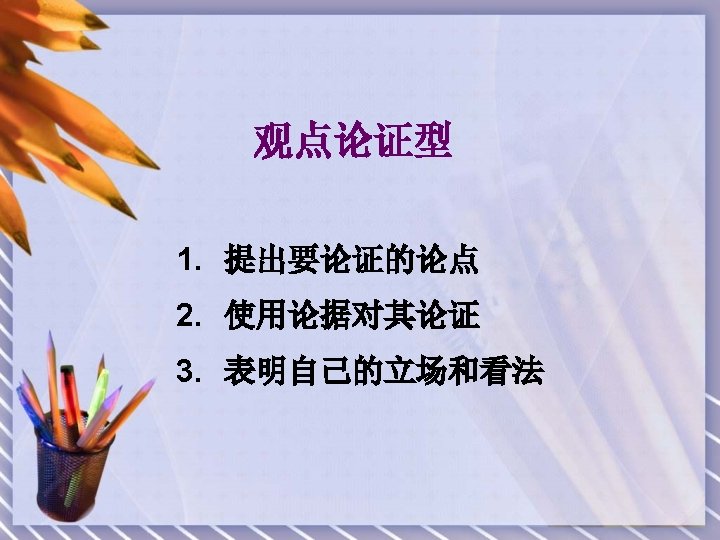 观点论证型常用句型 § (1)It’s fairly well known that…plays an important role in…/It’s fairly well known that…is of great/vital importance to… 众所周知,…起着重要作用。 § (2)There are many reasons explaining… 解释…有很多原因。 § (3)Many reasons can be figured out to prove… 证明…有许多原因。