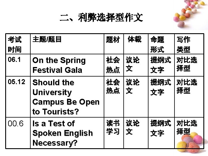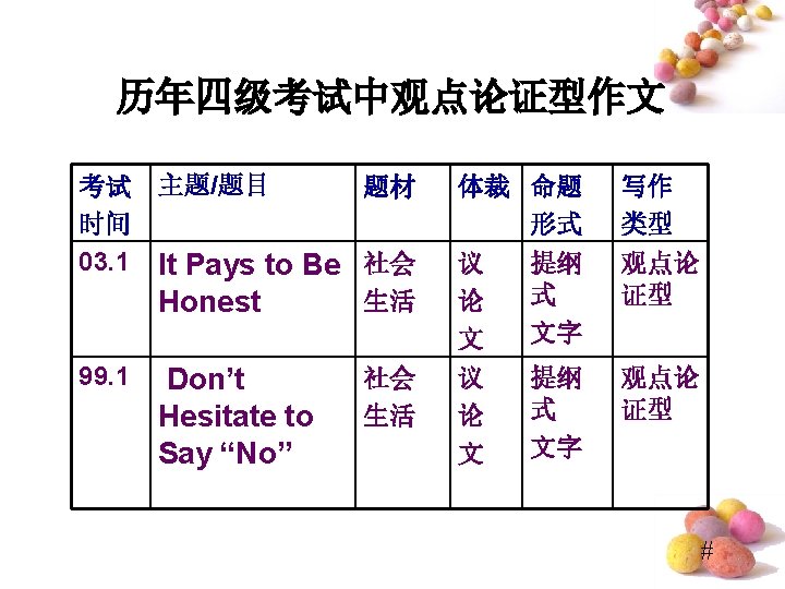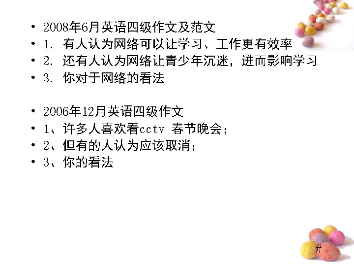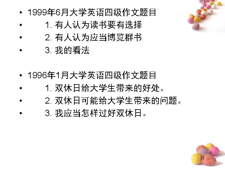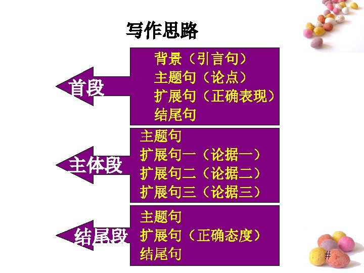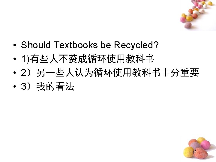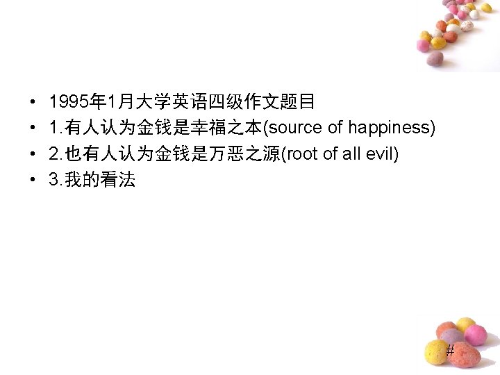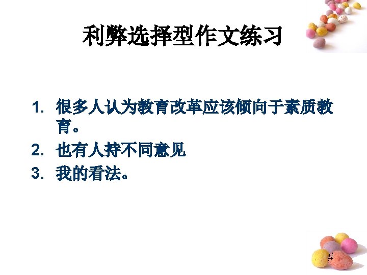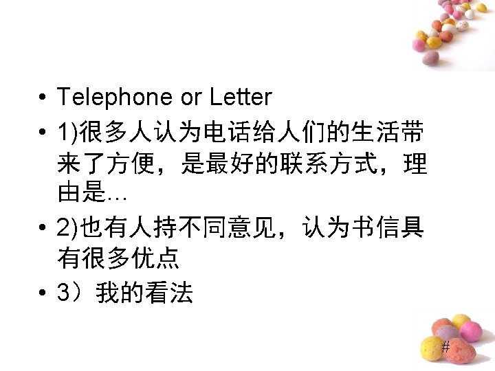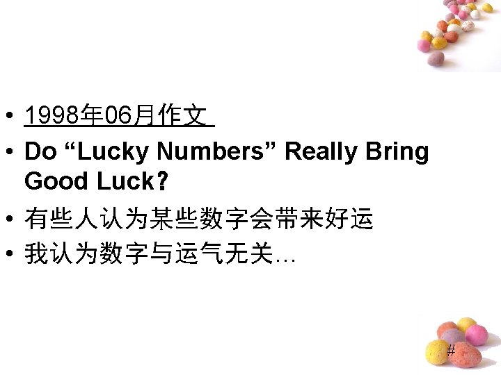 Do “Lucky Numbers” Really Bring Good Luck? • ⑴Quite a few people believe “lucky numbers” like “ 8” can bring them good luck. ⑵Even some people spare no expense to get their telephone numbers or car numbers to include “ 8”. ⑶However, I hold the entirely different view. (提出观点段) • ⑷Of course, “lucky numbers” may sound propitious and make people feel good. ⑸For examples, those people who believe “lucky numbers” may feel hopeful and become confident when they are in difficulty. ⑹But it doesn’t mean that numbers really bring good luck. ⑺In my opinion, numbers are only numbers, which have nothing to do with one’s luck. (反面论证 段) #