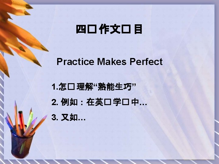Practice Makes Perfect “Practice makes perfect”, is a proverb full of logic, which has been generally accepted. It tells us that if we practice unfamiliar things again and again, we’ll be able to perform it perfectly. The truth of it is deep and profound. Many remarkable examples contribute to this argument. A case in point is in order to learn English well, we need extra practice, such as reading English books, going to English corners or communicating with foreigners. This is close to suggest that people can grasp English only if they follow