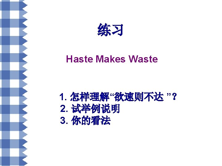 For another example, students who answer questions in a hurry in their tests are usually found making more mistakes than others. Moreover, some students may fail their tests just because they are too hurried to write their names down on test papers. All mentioned above tell us that we should pay attention to the tempo of work. But one thing we have to notice is that although more haste may lead to less speed, we should highly efficient and avoid idleness. In short, whatever we do, we should achieve a balance between the speed and the quality because haste makes waste.