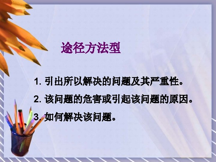 • 七)开篇 1) Many nations have been faced with the problem of. . . 2) Recently the problem has been brought into focus. 3) Recently the phenomenon has become a heated topic. 4) Recently the issue has aroused great concern among. . . #