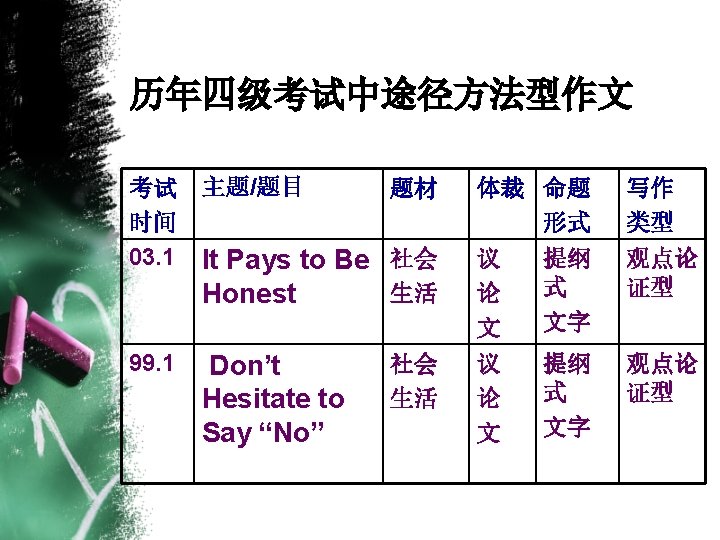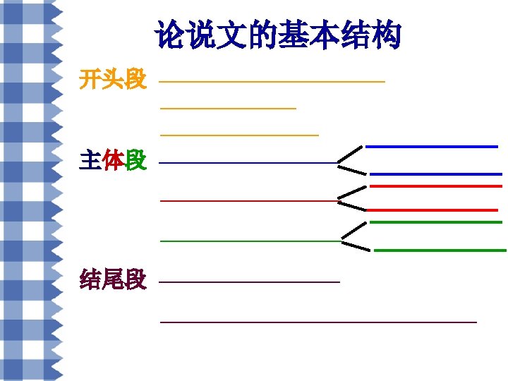 • 四)批驳 1)It is true that. . . , but one vital point is being left out. 2) There is a grain of truth in these statements, but they ignore a more important fact. 3) Some people say. . . , but it does not hold water. 4) Many of us have been under the illusion that. . . 5) A close examination would reveal how ridiculous the statement is. #