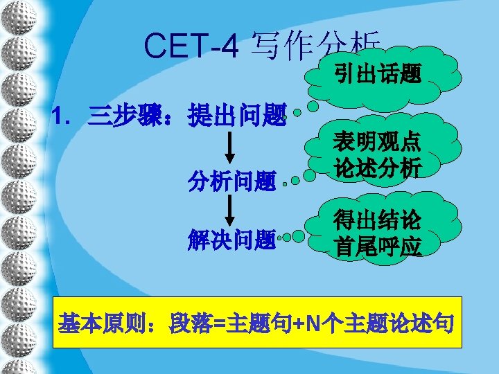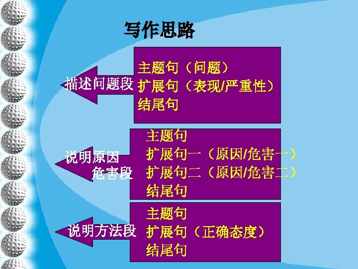 八)结尾 1) From what has been discussed above, we can draw the conclusion that. . . 2) It is high time that strict measures were taken to stop. . . 3) It is necessary that steps should be taken to. . . 4) In conclusion, it is imperative that. . . 5) There is no easy method, but. . . might be of some help. 6) To solve the above-mentioned problem, we must. . . 7) In summary, if we continue to ignore the above-mentioned issue, more problems will crop up. #