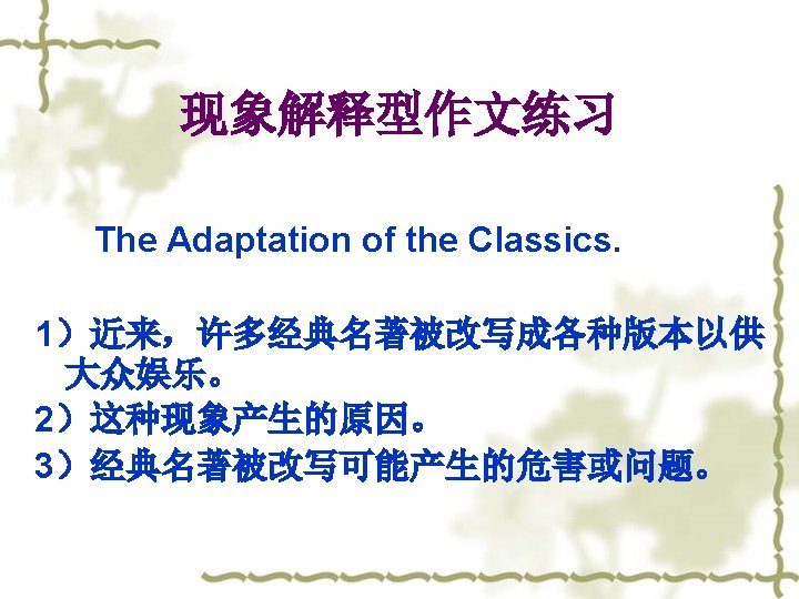 The Adaptation of the Classics 现象型开头句型套句一 Recently many classics are being adapted in many ways, which has aroused great concern. In those adapted works, all plots are changed and all characters become somewhat clown. 开头句的扩展句
