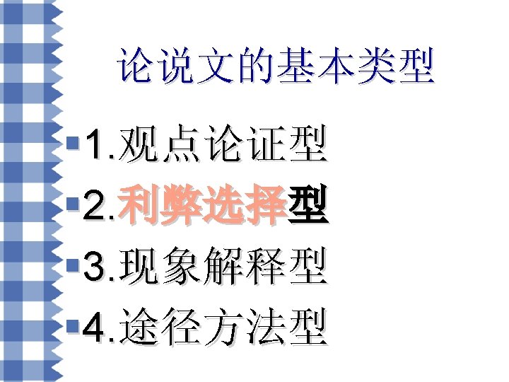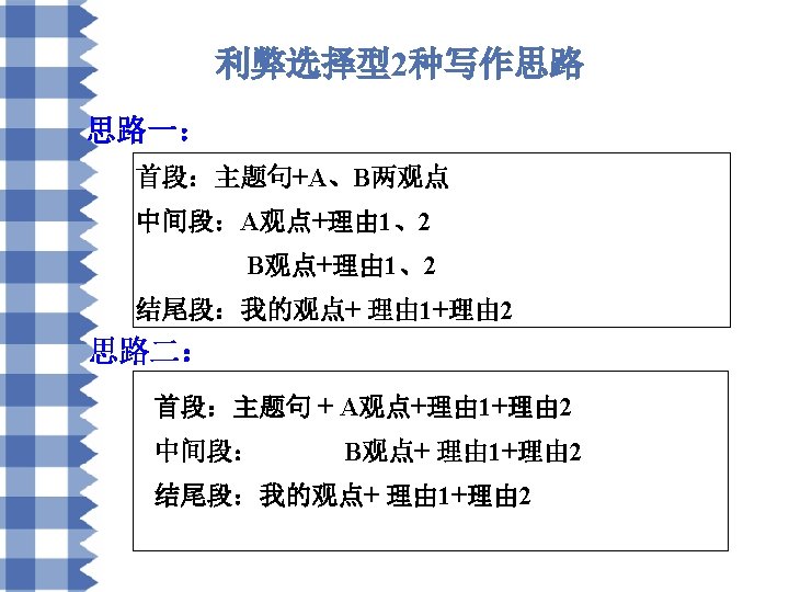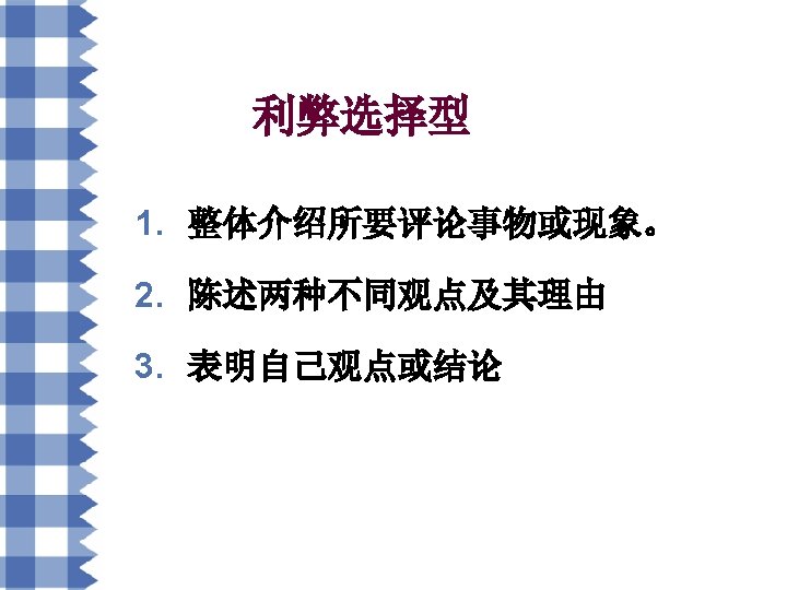 利弊选择型常用句式 • • There is a general discussion nowadays on the problem of…Some argue/hold that…, but others set forth a totally different argument about the issue. 如今,…问题引起了广泛讨论。有些人认为…, 但是其他人则对此持完全相反的观点。 #