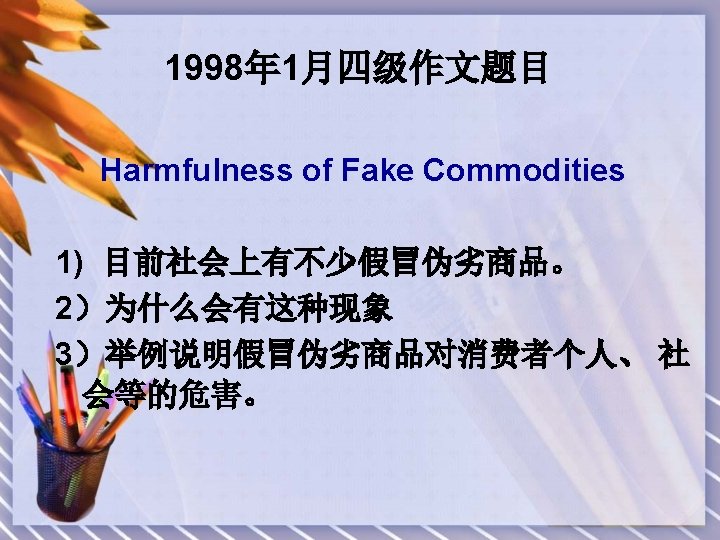 结尾段 ⒀ ⒁ ⒂ ⒃ As far as I am concerned, 我的观点. For one thing, 具体看法+理由 For another, 具体看法+理由 In a word, 总结观点 As far as I am concerned, any society which ignores this phenomenon would come to no good end. For one thing, fake commodities, such as appliances may cause a great loss to producers of real products. For another, fake commodities such as medicine may harm people’s health, even lives. In a word, it is high time to take measures to eliminate fake commodities.