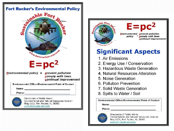 Environmental Management System (EMS) Each post organization is integrated into the EMS through Environmental Officers / Environmental Point of Contacts All organizations on Fort Rucker must formally appoint an EO or EPOC using USAACE Form 2729, Environmental Officer and EPOC Appointment Memo according to GC Policy Memo 13 -35 dated 9 JAN 13. EMS programs shall include measurable environmental goals, objectives, and targets that are reviewed and updated annually Includes all environmental media areas in addition to the significant aspects U. S. ARMY AVIATION CENTER OF EXCELLENCE & FORT RUCKER