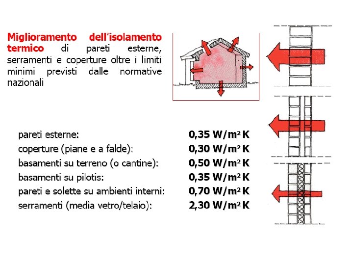 Quadro Legislativo di riferimento Come? -miglioramento delle proprietà termofisiche degli elementi di involucro, con particolare attenzione alla resistenza termica delle chiusure opache e delle superfici trasparenti; - definizione di forma e orientamento dell’edificio in accordo ai principi dell’architettura bioclimatica, tali da sfruttare al meglio le caratteristiche morfologiche e climatiche del sito esterno. -incremento dell’efficienza energetica degli impianti di illuminazione e climatizzazione e delle apparecchiature elettriche (es. : elettrodomestici); -installazione di impianti di utilizzazione di energia rinnovabile;