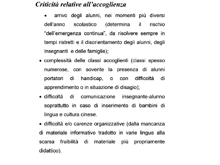 Criticità relative alla valutazione Scarsa circolarità delle informazioni dei dati dell’alunno dovuta ad una inefficace comunicazione tra Segreteria-docenti-mediatori. Scarsa conoscenza dei sistemi scolastici dei paesi di provenienza che permetta di far comprendere a grandi linee il patrimonio culturale dell’alunno. La carente o inesistente competenza nella lingua veicolare che impedisce lo scambio fra genitori/alunno e insegnanti. Mancanza di adeguati strumenti di valutazione e documentazione
