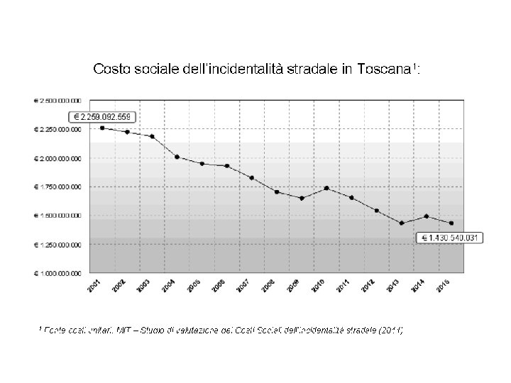 Direzione Politiche Mobilità, Infrastrutture e Trasporto Pubblico Locale Settore Programmazione Viabilità Le vite umane ed i costi legati all’incidentalità stradale: centro Costo medio della vita umana: euro 1. 502. 025, 00 - Mancata produttività media euro 940. 291, 00 - Danni non patrimoniali medi euro 561. 734, 00 Costo medio sanitario Costo medio umano per DECESSO (CM) (1) euro 1. 965, 00 euro 1. 503. 990, 00 Costo medio per ferito grave Cfg (197. 228*0, 14) euro 27. 611, 92 Costo medio per ferito lieve Cfl (16. 985*0, 86) euro 14. 607, 10 Costo medio umano per FERITO (CF) (1) CF=Cfg*0, 14 + Cfl*0, 86 euro 42. 219, 02 Danno patrimoniale medio per incidente euro 7. 686, 00 Costi amministrativi medi per incidente euro 3. 300, 00 Costi Generali medi per INCIDENTE (1) euro 10. 986, 00 (1) Ministero delle Infrastrutture e dei Trasporti DIPARTIMENTO PER I TRASPORTI, LA NAVIGAZIONE ED I SISTEMI INFORMATIVI E STATISTICI Direzione Generale per la Sicurezza Stradale “Studio di valutazione dei Costi Sociali dell’incidentalità stradale” uscite
