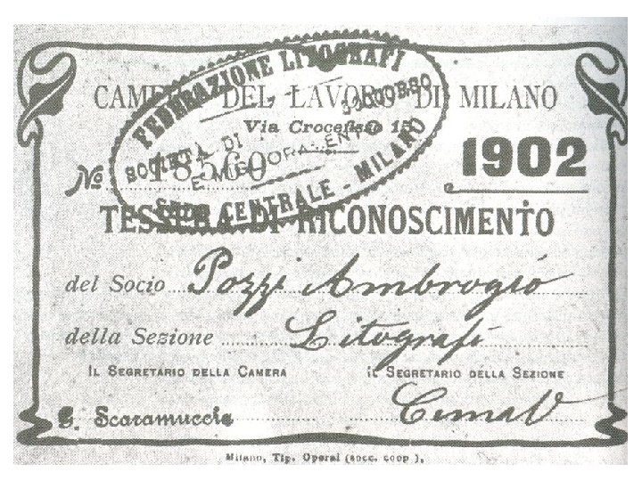 Federazioni di mestiere esistenti in Italia ai primi del ‘ 900 (da Procacci) Federazione anno di costituzione Edilizia 1886 Federazione del libro 1893 Panettieri 1895 Litografi 1897 Ferrovieri 1900 Lavoranti in pellame 1901 Lavoranti in prodotti chimici 1901 Arti tessili 1901 Cappellai 1901 Orefici 1901 Impiegati e commessi aziende priv. 1901 Metallurgici 1901 Lavoranti in legno 1901 Etc………. iscritti 29. 000 9. 600 3. 000 1. 000 41. 000 3. 964 6. 000 18. 000 5. 220 659 4. 500 50. 000 6. 000